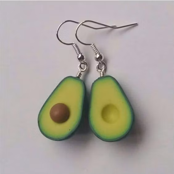 Ett par örhängen föreställer en, delad avokado, så bara den ena halvan har en kärna.