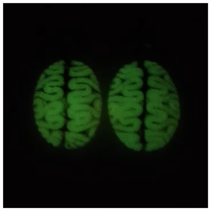 Örhängen med små självlysande hjärnor. Gjorda av glow-in-the-dark-lera, så hjärnorna skimrar i mörkret. Längd på hjärnan, ca 2 cm.