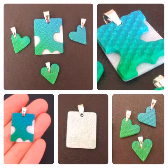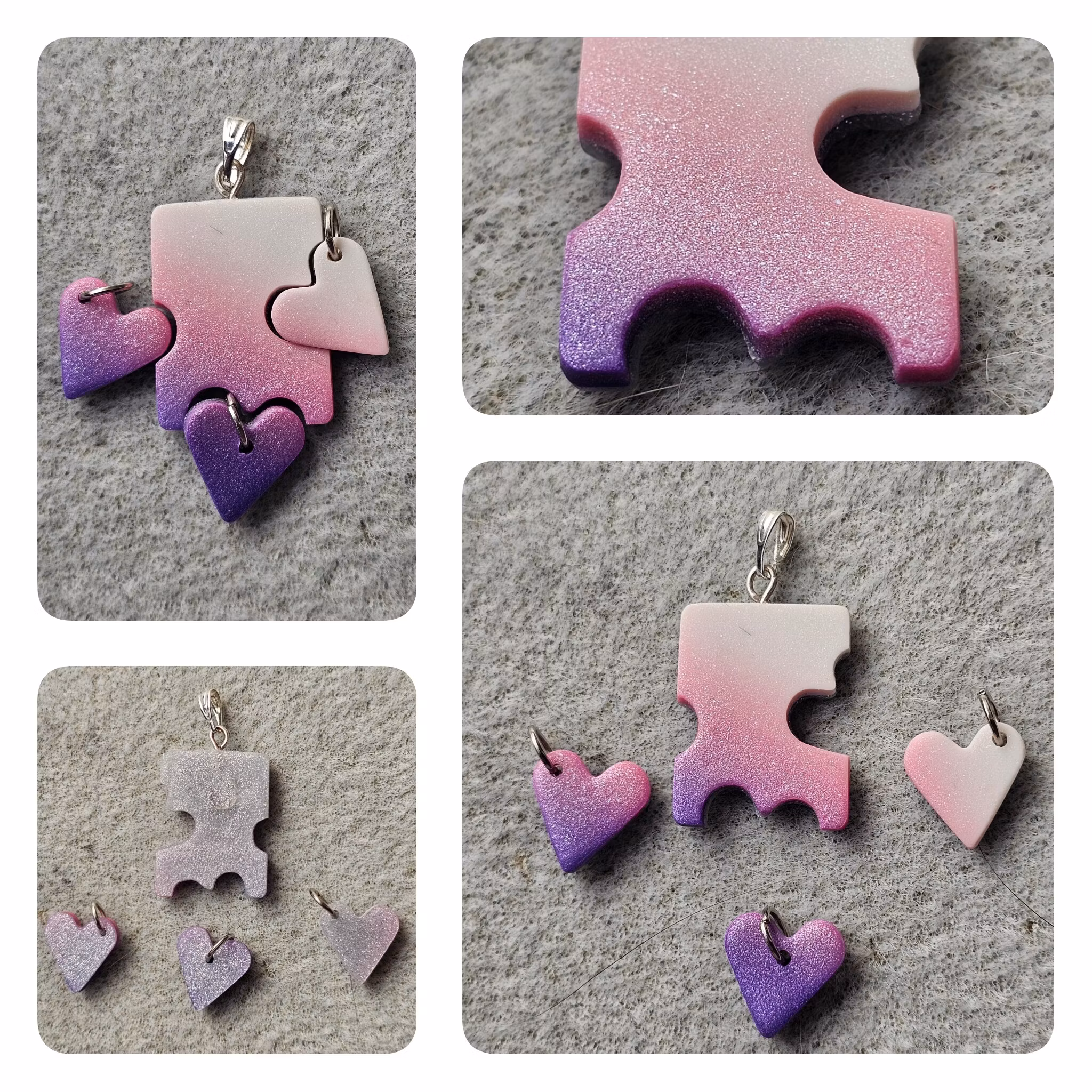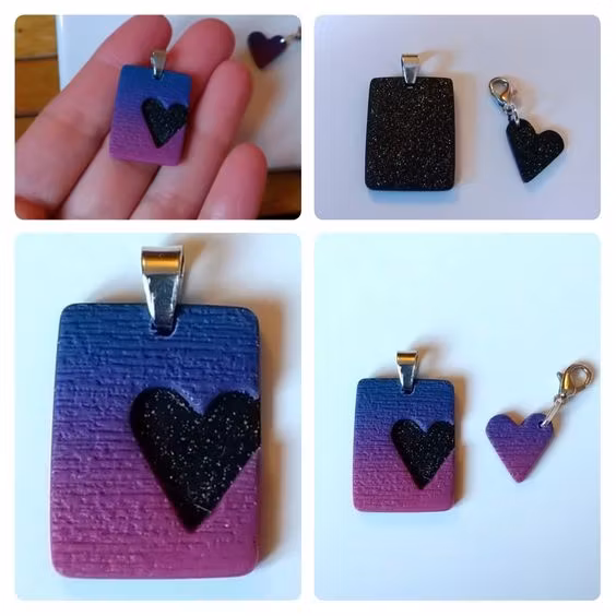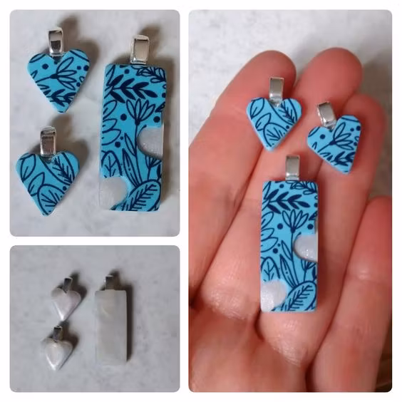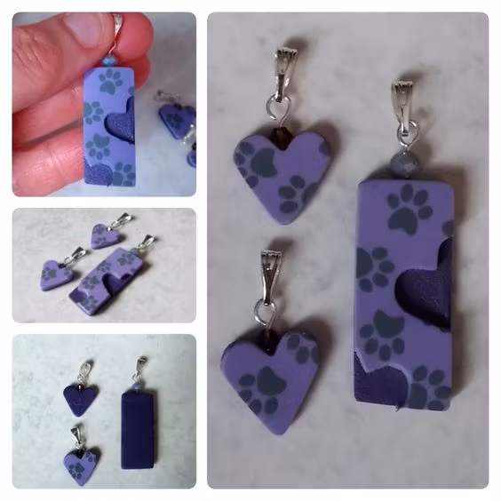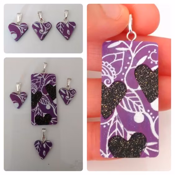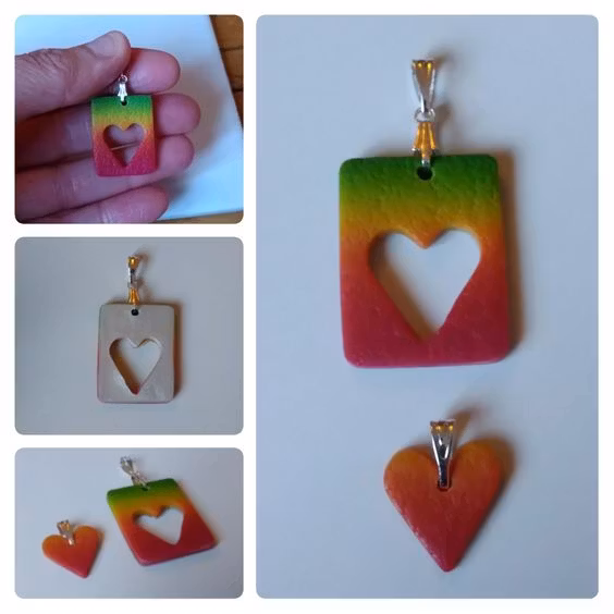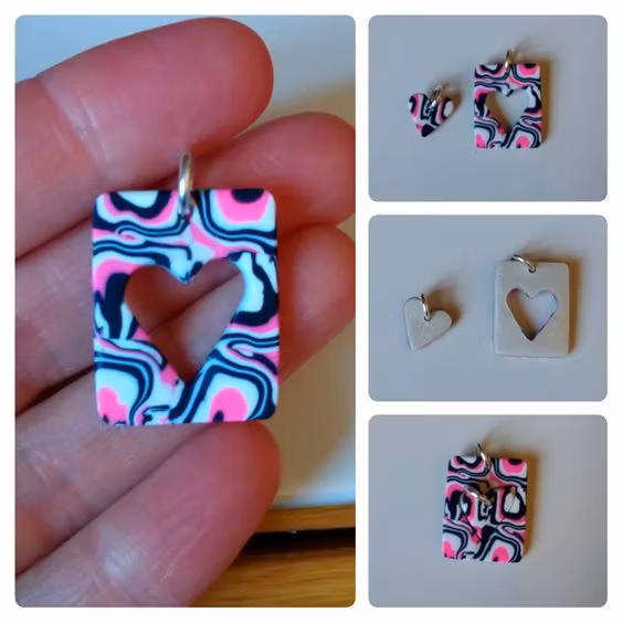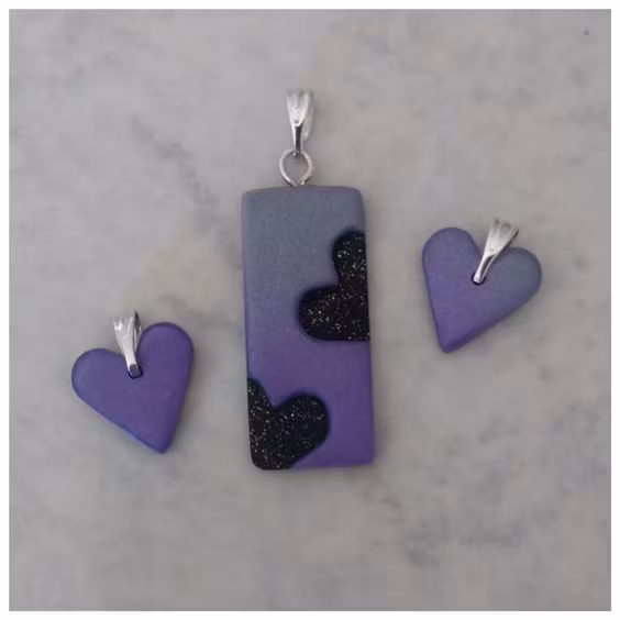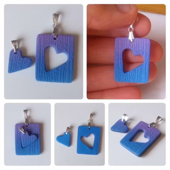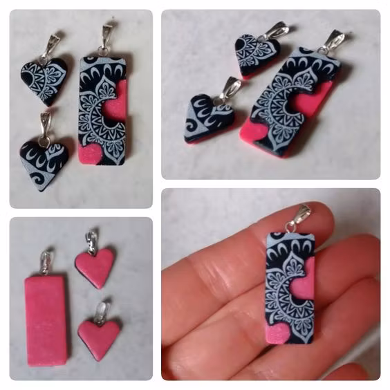 Varje set består av minst två delar; ett större hänge och ett eller fler mindre delar som är helt eller delvis utstansade från det större hänget. Vissa hängen har hål rakt igenom där hjärtat är utstansat, och vissa har ett tunnare lager lera i en kontrasterande färg där. Alla set är unika, dvs det finns inte två som är likadana. Mönster och storlekar skiljer sig åt mellan olika hängen, men de utstansade delarna är oftast små hjärtan. De små hjärtana är ca 1,5 x 1,5 cm stora. De större hängena är lite olika stora beroende på modell, ca 2-3 x 3-4 cm.
