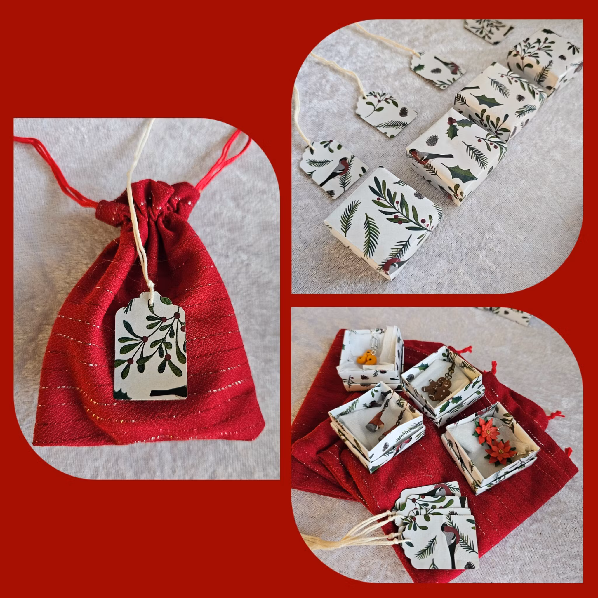 Örhängena är förpackade i fyra små lådor, och varje låda ligger i en liten tygpåse. Det följer även med en liten matchande etikett till varje låda, så du kan skriva en hälsning. Perfekt att ge bort en liten påse varje advent till nån.